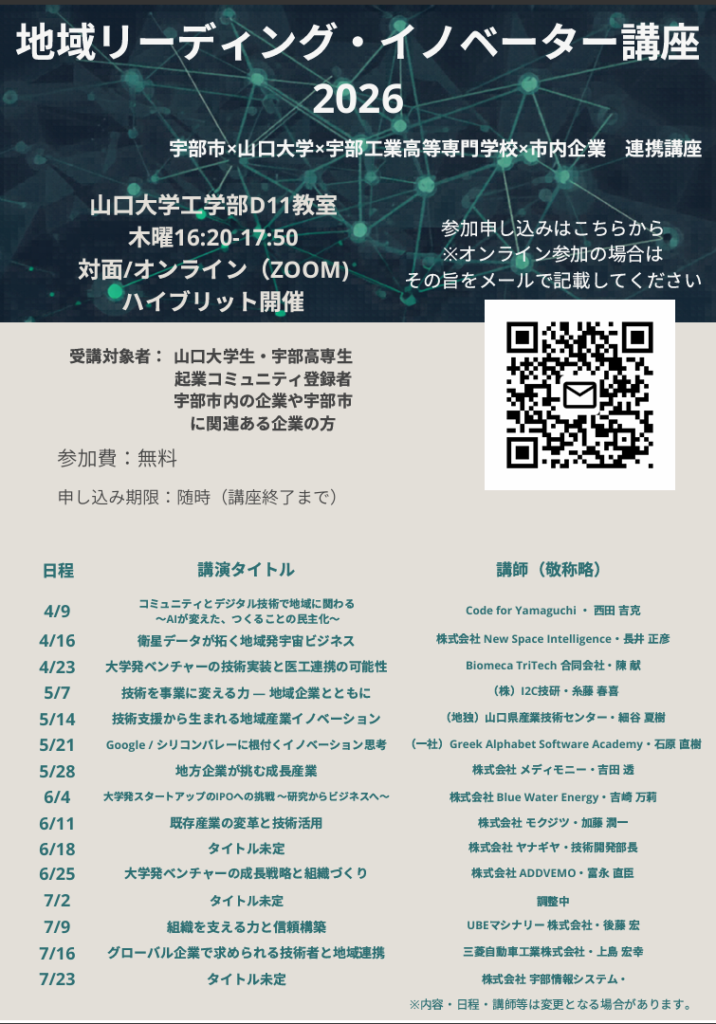 ●対象者:山口大学生・宇部高専生、起業コミュニティ登録者、宇部市内の企業や宇部市に関連ある企業の方