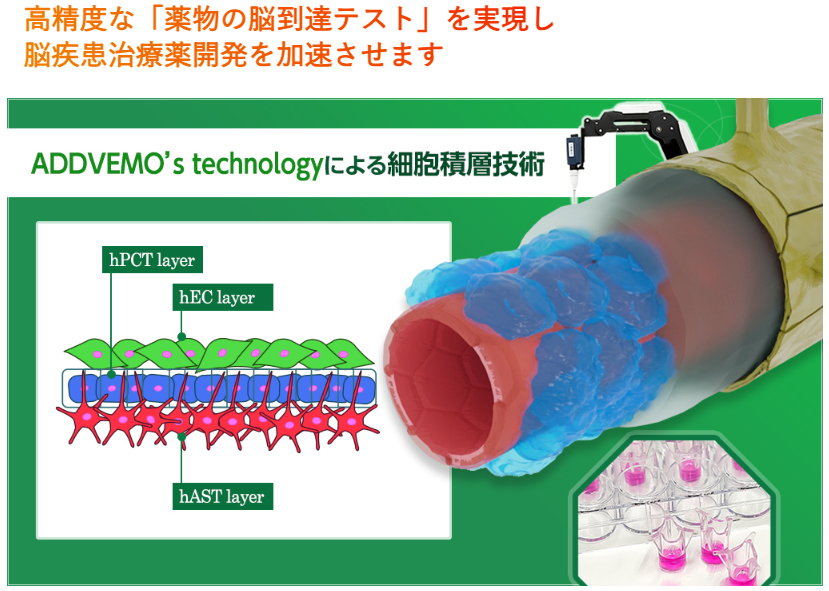ADDVEMO社の開発したヒト脳血管モデルは、この課題を解決する独自技術です。バイオ領域の脳に対する産業利用可能なヒト生体模倣システム(MPS)としては、本BBBモデルが世界初であり、高精度な「薬物の脳到達テスト」を実現することができるため、脳創薬・脳研究業界に大きな影響を与える可能性を秘めています。